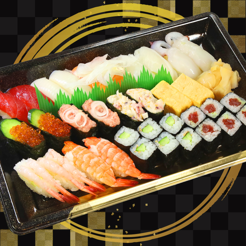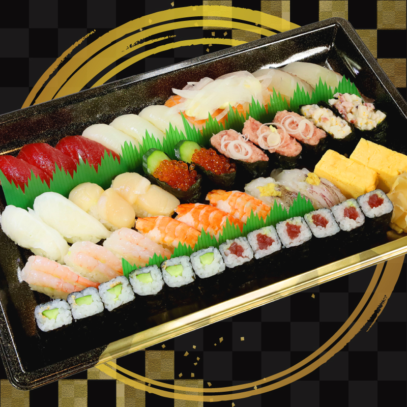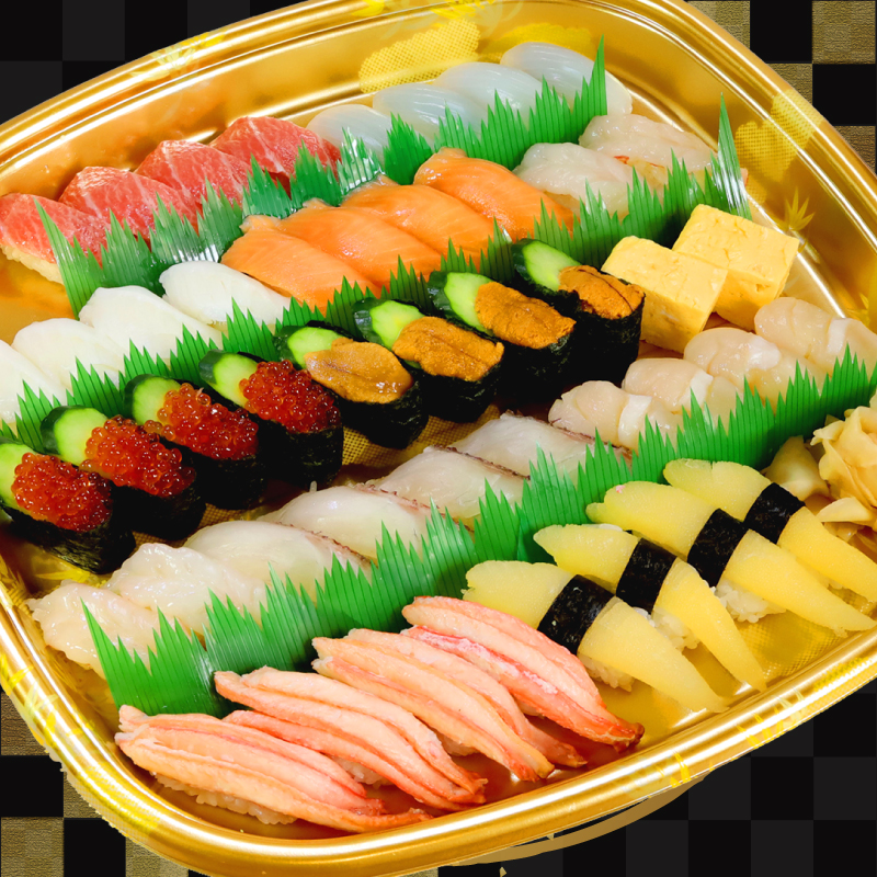 本マグロ大トロ・紋甲イカ・エンガワ・サーモン・生エビ・いくら・うに・たまご・ホタテ・ズワイガニ・数の子・白身
